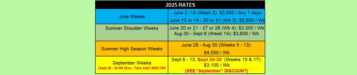 DISCOUNT AVAILABLE for booking multiple weeks in June & Sept.